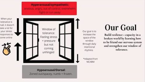 The goal of nervous system regulation is not to eliminate stress or to never react in certain situations. The goal is to develop the mental and physical capacity and resilience to handle stressors without chronic overwhelm. It also helps us to know how to regulate when we do experience overwhelm. An effective way to do this is to probe into our God-designed nervous system and understand our unique window of tolerance: