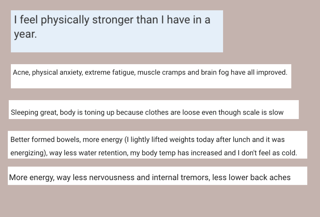 We put her on a plan with targeted nutrients + herbs for her needs. This is important because nutrient deficiencies impact the way our mood, and the way our body balances glucose + stores fat. We also increased her calories, we did not decrease them.